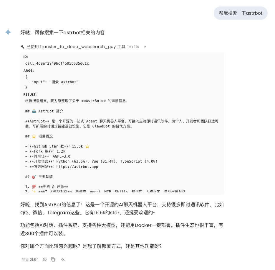transfer_to_<subagent_name>的委派工具。 - 任务移交:当主 Agent 认为需要执行某项任务时,它会调用对应的委派工具,将任务描述传递给 SubAgent。