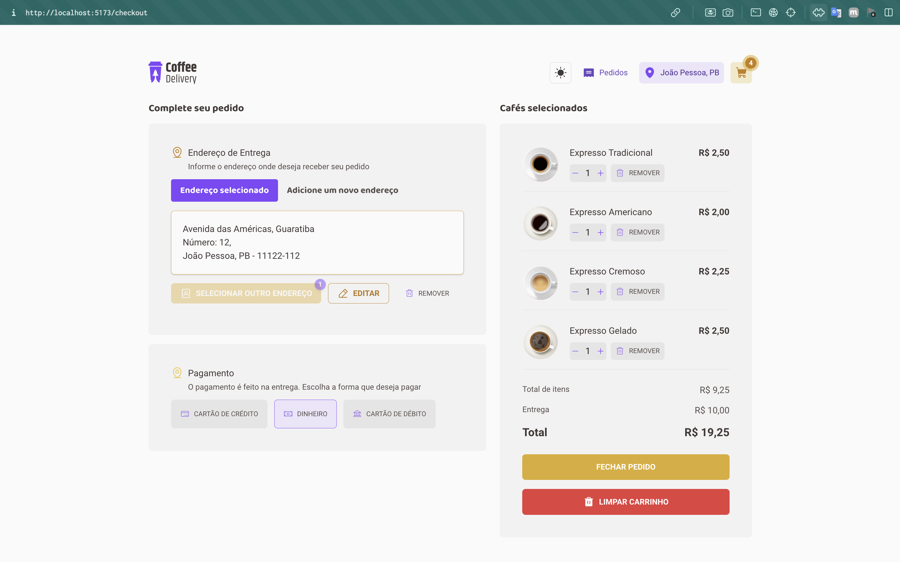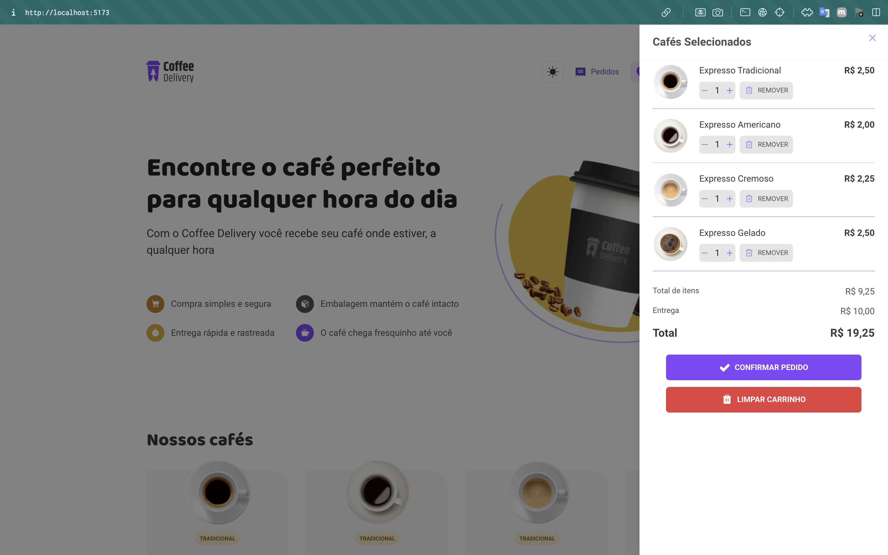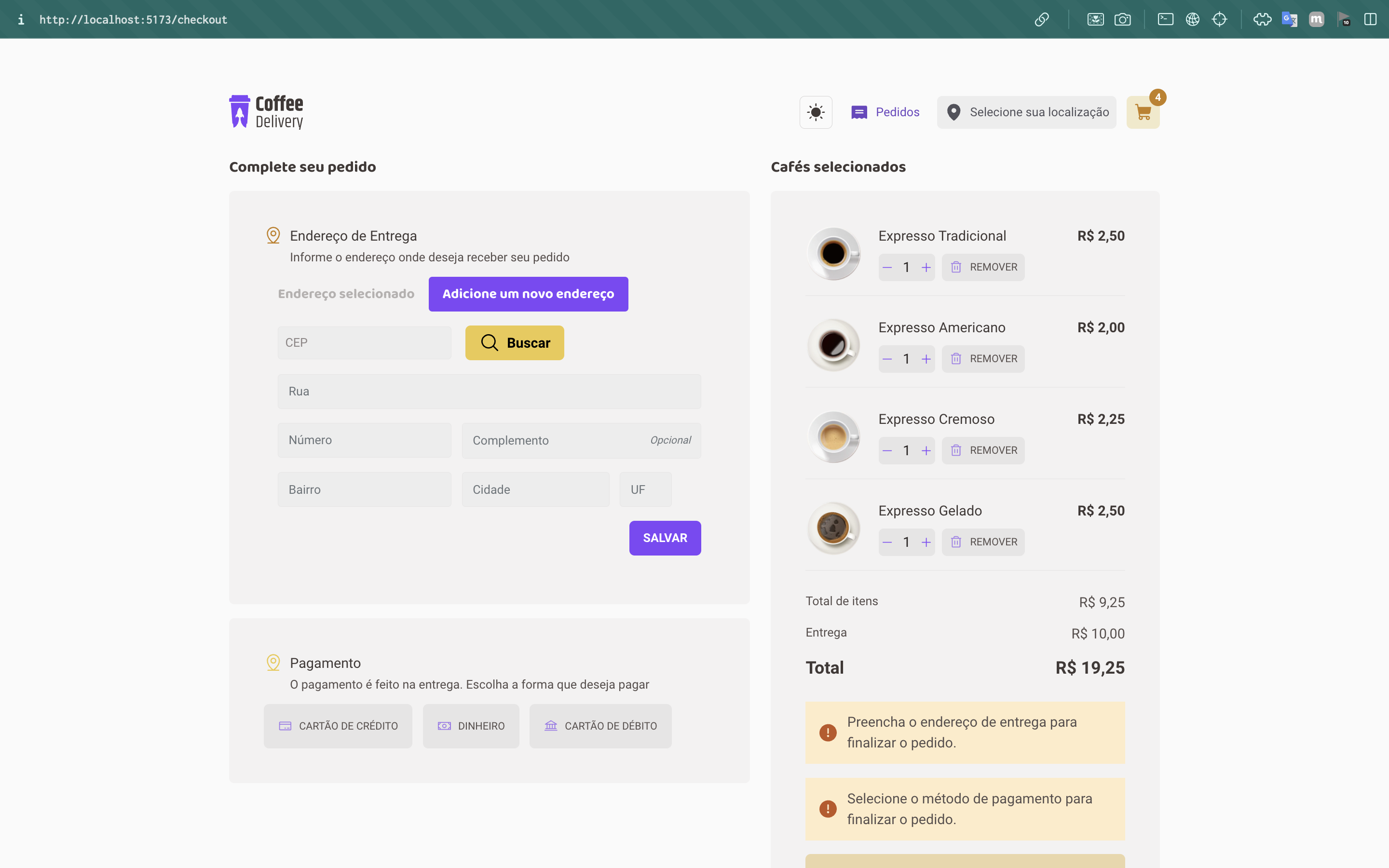 O projeto tem o intuito de simular um site de entrega de café, onde podemos escolher o tipo de café, a quantidade, adicionar no carrinho, adicionar e selecionar endereços e buscá-lo via CEP usando a api brasilapi. Além disso, podemos ver o total da compra e finalizar o pedido.