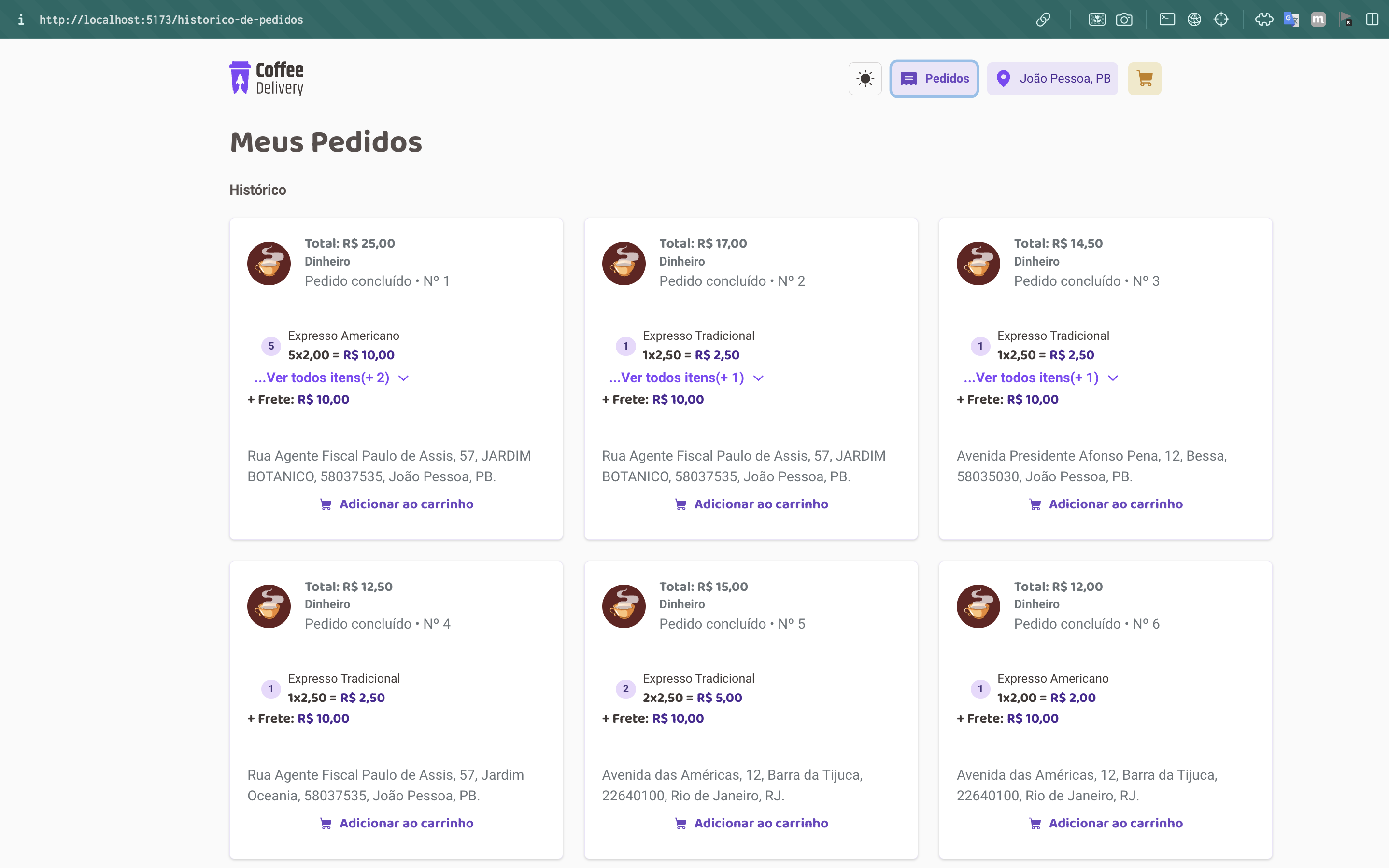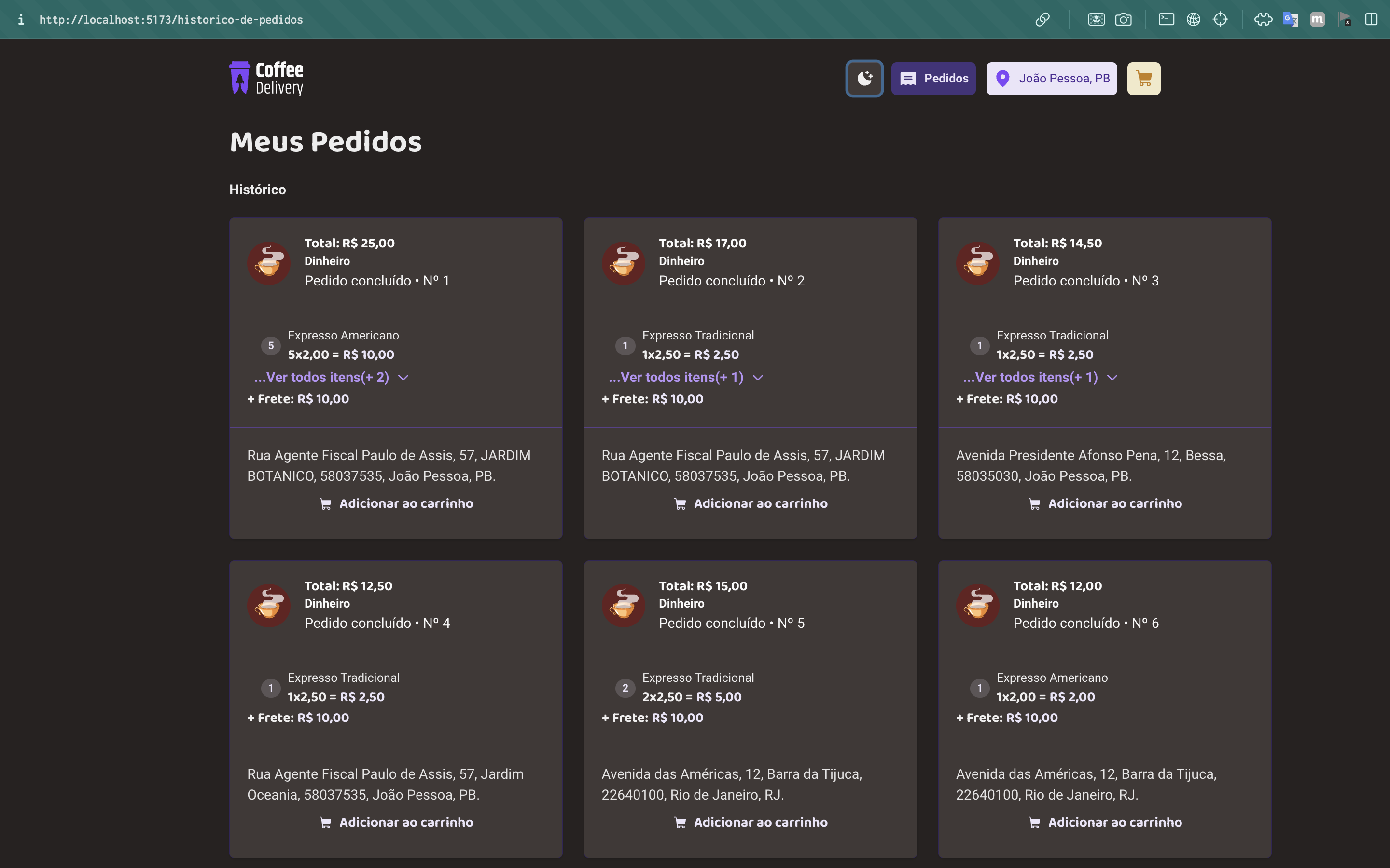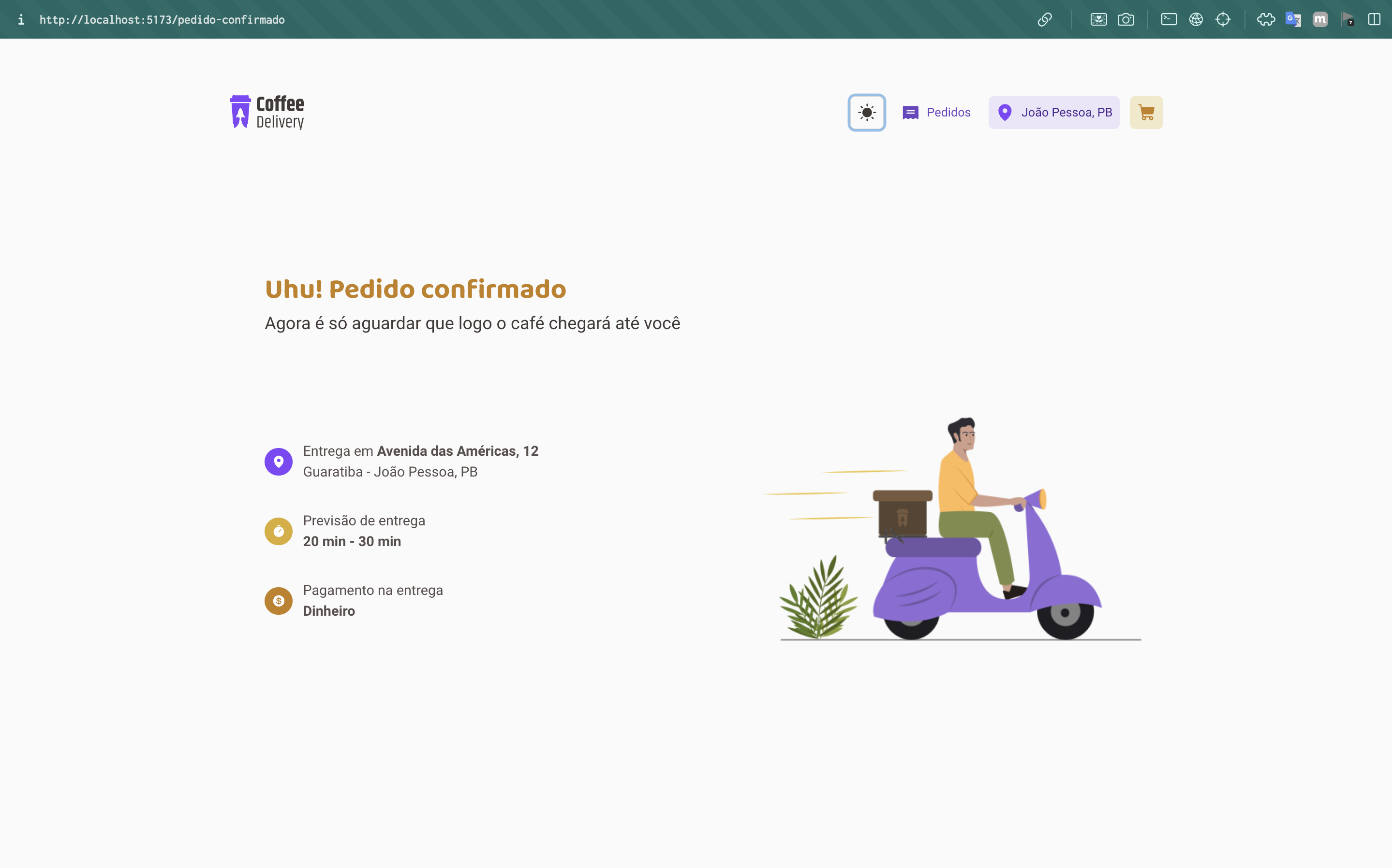 O projeto tem o intuito de simular um site de entrega de café, onde podemos escolher o tipo de café, a quantidade, adicionar no carrinho, adicionar e selecionar endereços e buscá-lo via CEP usando a api brasilapi. Além disso, podemos ver o total da compra e finalizar o pedido.