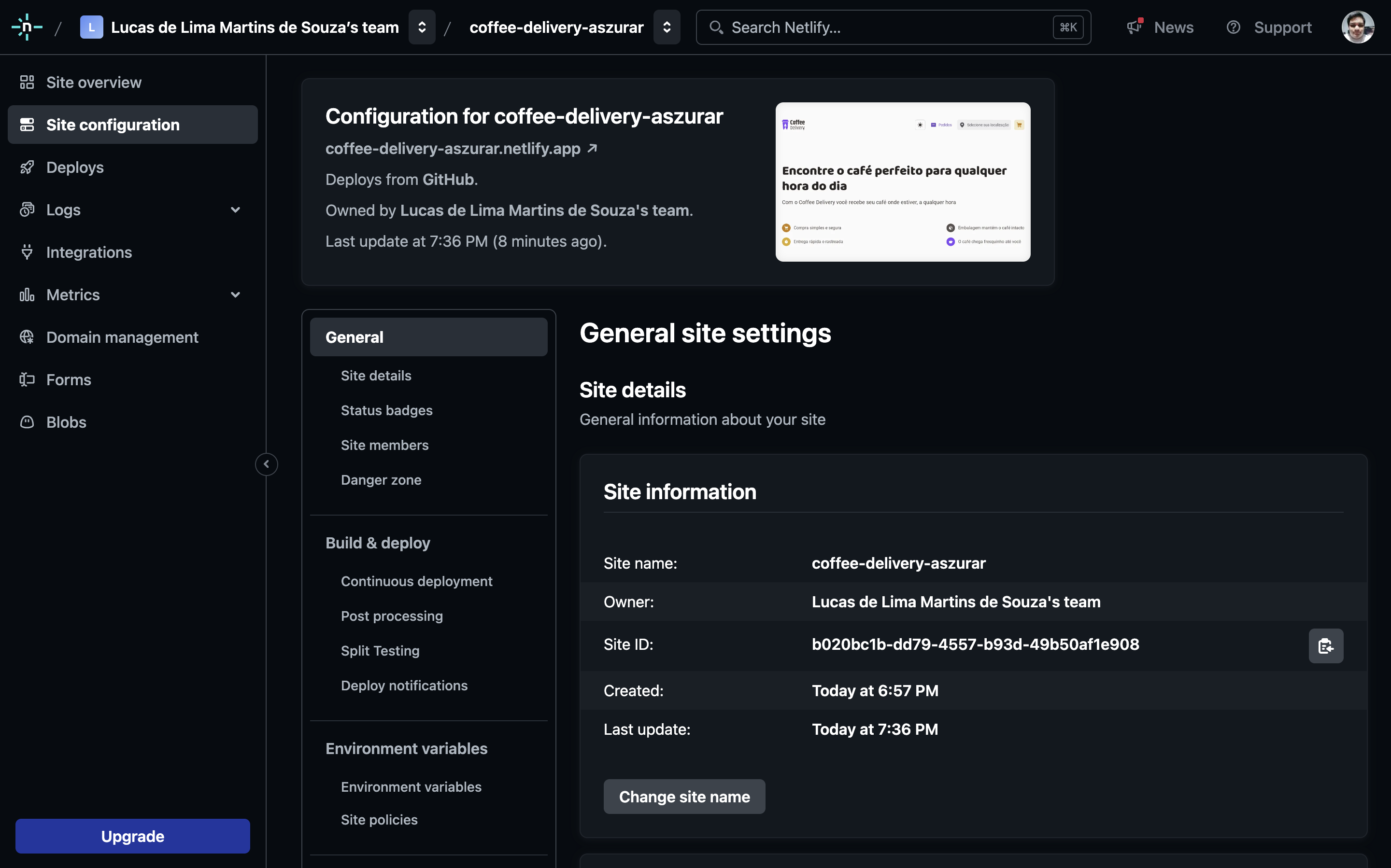 - Com isso, o CI/CD já é aplicado automaticamente por meio dessa plataforma definindo a branch de produção, sempre que houver uma atualização nela, será gerado uma nova versão do projeto e já publicado.