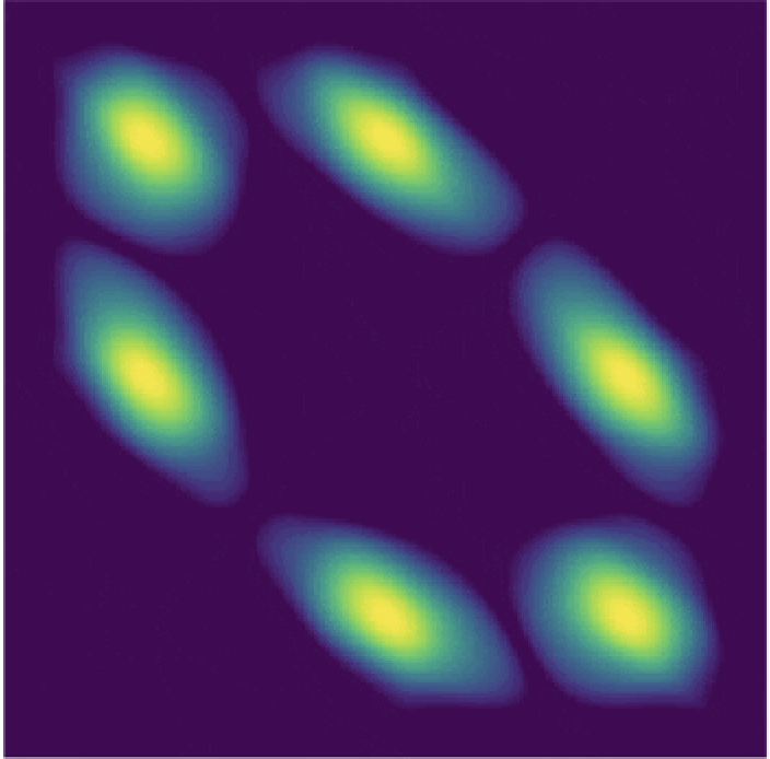 Note that 1024 samples are used per epoch. 200 epochs were used for the results in the paper. The learned density is given below, in comparison with the ground truth density: