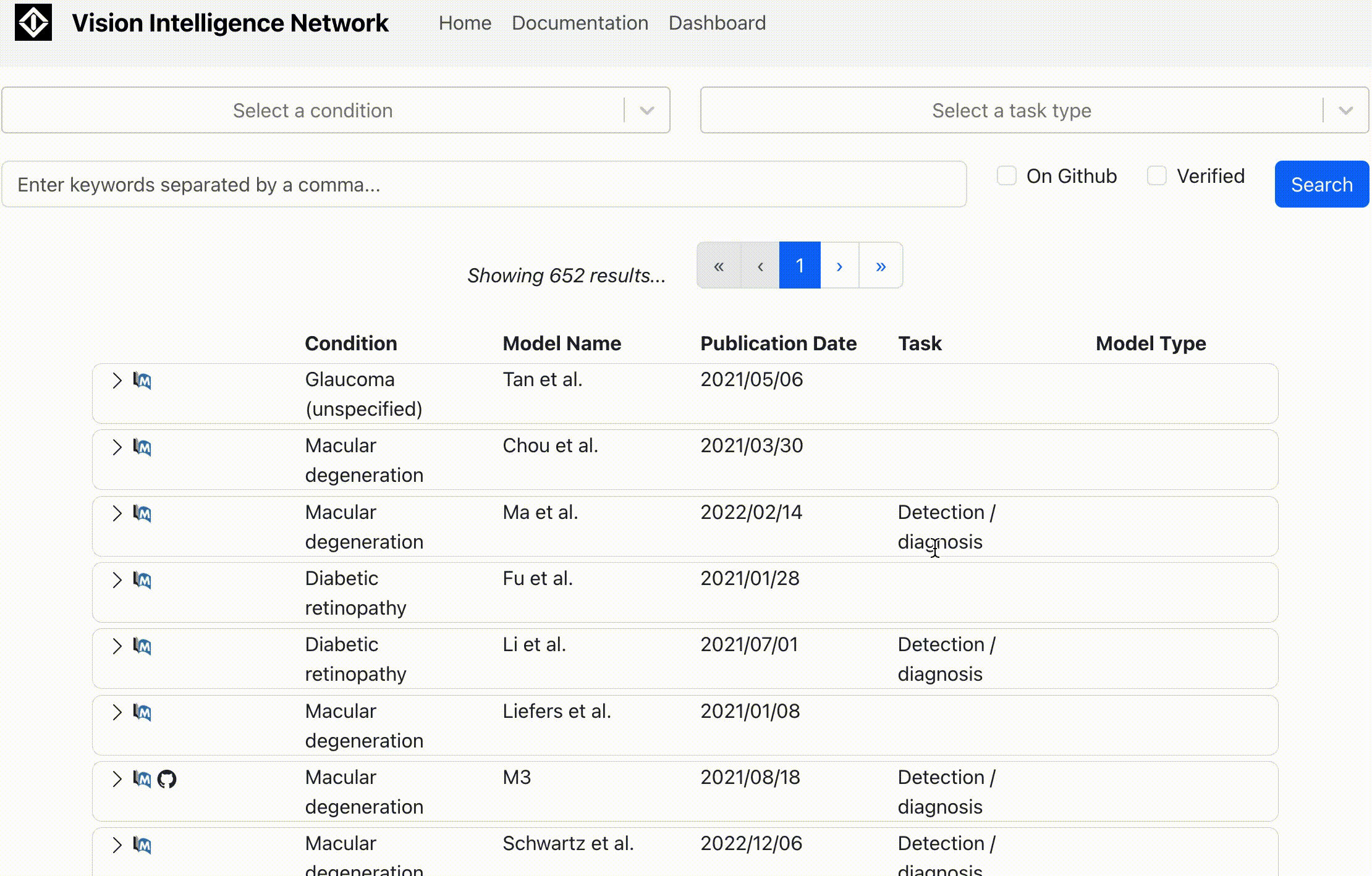 This project is an light-weight app to provide easy search and retrieval of published AI research in the field of opthalmology. Users can search publications by condition, model goals, and keywords: