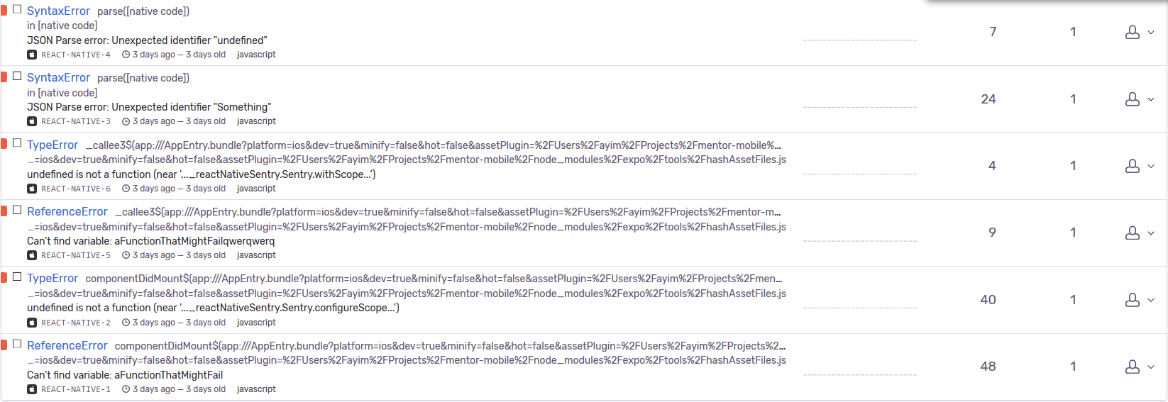 @callumdmay from experimenting with Sentry, seems to me that the catchall for JS exceptions is enabled by default. Looks like there were a number of JS exceptions not in a try/catch that were logged - the first two in the list were simple syntax errors. |