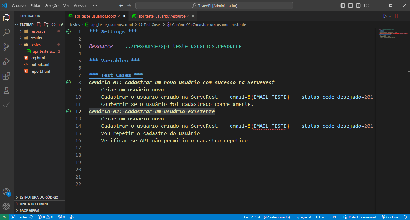 Na pasta Pasta Testes: foi criado um arquivo api_teste_usuarios.robot o qual foi escrito 2 cenários e 7 casos de testes, como mostra a imagem abaixo: