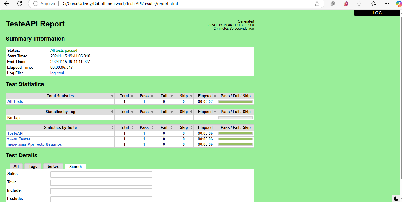 Na Pasta Results: foi gerados 2 arquivos em formato html: um é o LOG e o outro o Report.