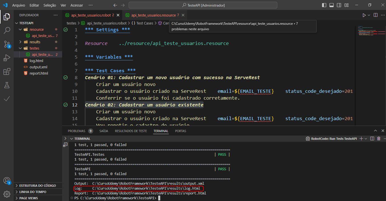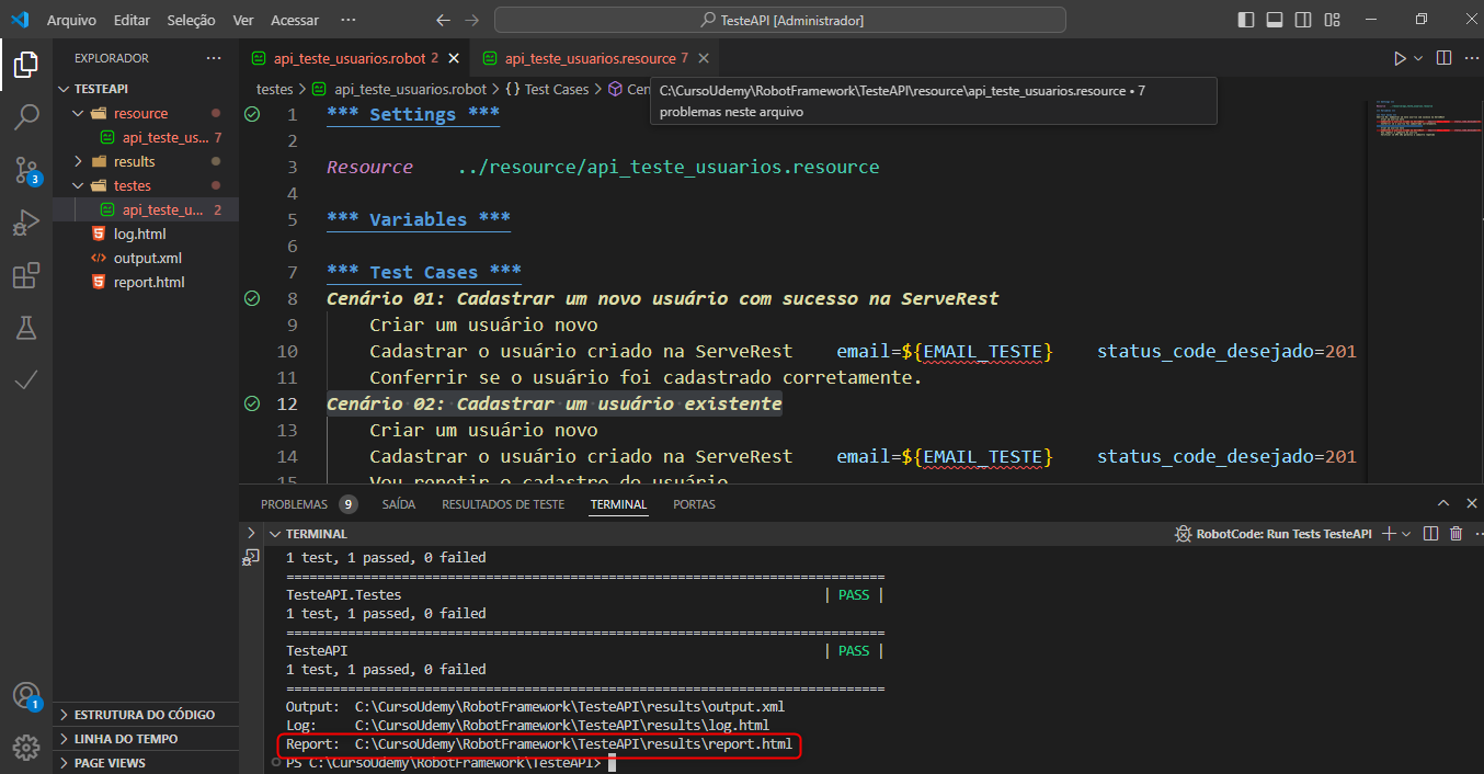Na Pasta Resources: foi criado um arquivo api_teste_usuarios_resource onde foi declarada as bibliotecas, a keywords e declaração de variáveis, como mostra a imagem