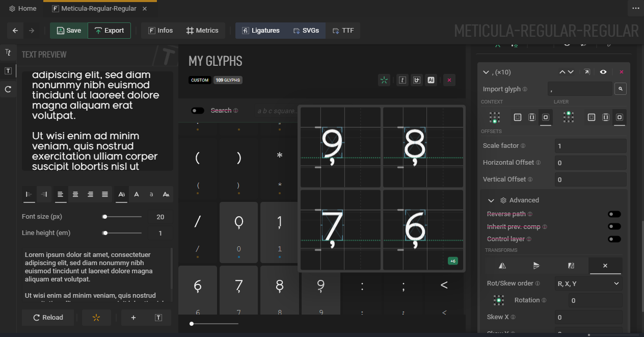 Screenshots are showcasing the font Meticula.