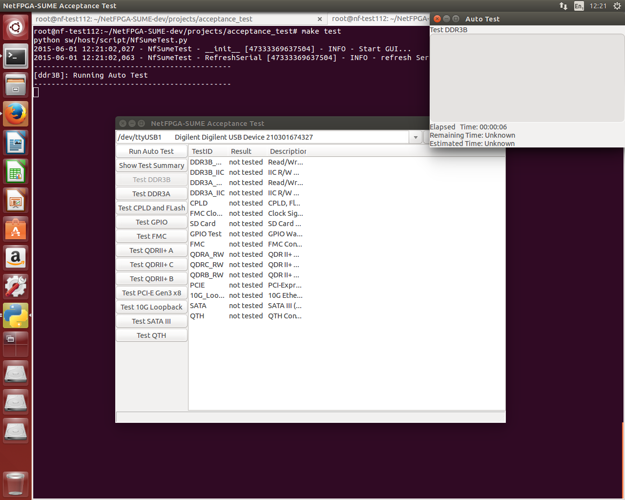 The Acceptance Test is performed by the NetFPGA-SUME’s Virtex7 FPGA. The status of the tests is displayed using a python-based GUI. An Acceptance Test suite, containing the hw design along with supporting software, is provided in the NetFPGA-SUME github repository under the projects/acceptance_test/ subdirectory.