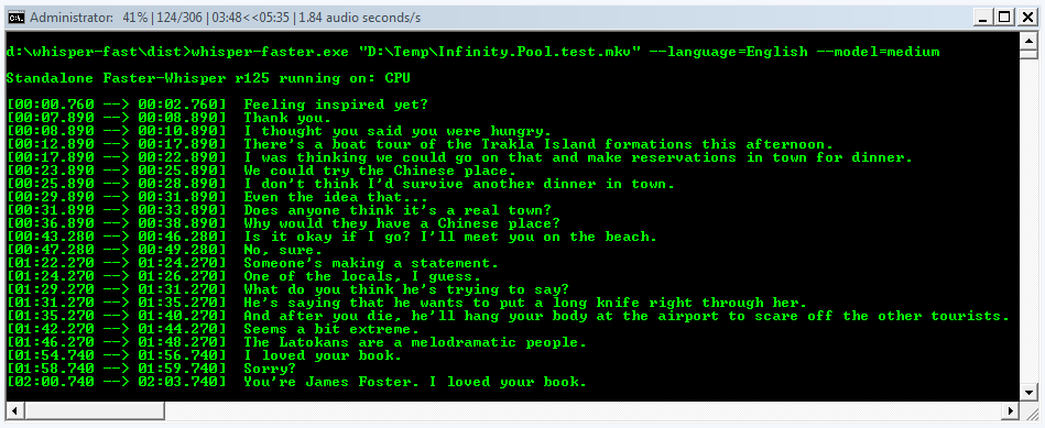 faster-whisper-xxl.exe "D:\videofile.mkv" --language English --model medium --output_dir sourcefaster-whisper-xxl.exe "D:\Folder" -l en -m turbo --sentence --batch_recursivefaster-whisper-xxl.exe "D:\videofile.mkv" -l ja -m medium --task translate --standard -o sourcefaster-whisper-xxl.exe --help