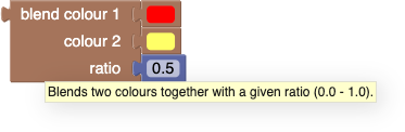 This block blends two colours together, as though one were mixing paint together (actually light, not paint). The example below produces the colour that would be obtained by mixing equal amounts of red and yellow (the result would be orange).