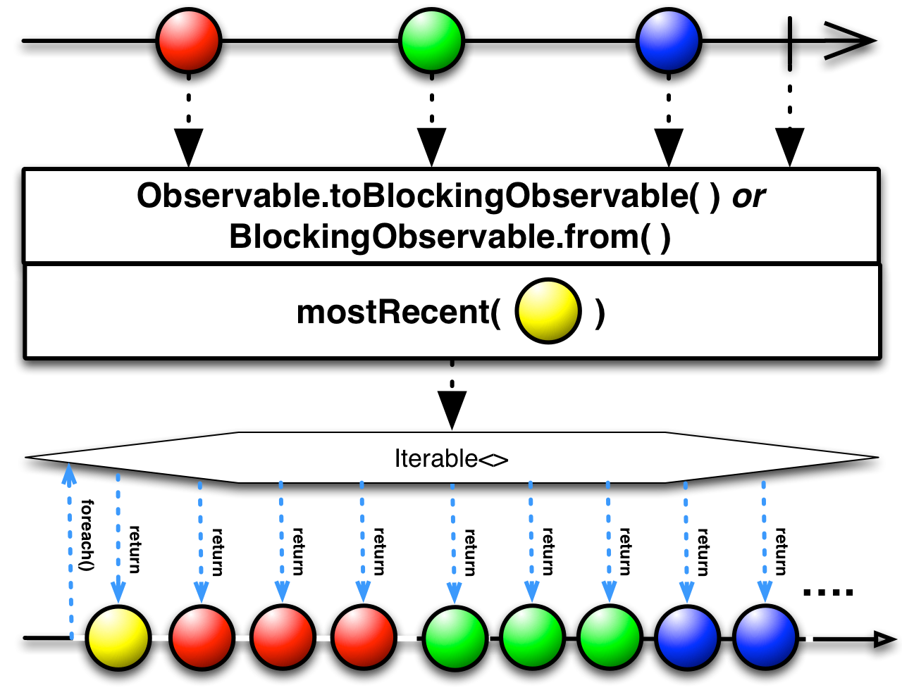 The mostRecent() method returns an iterable that on each iteration returns the item that was most recently emitted by the underlying Observable (or null if the Observable has not yet emitted an item or has completed without emitting any).