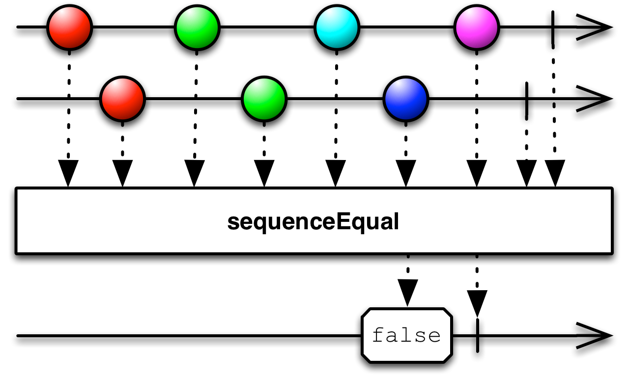 sequenceEqual( )— test the equality of the sequences emitted by two Observables
