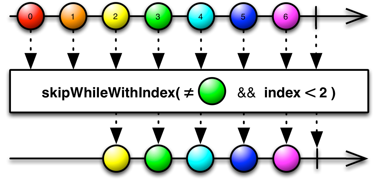 skipWhile( )andskipWhileWithIndex( )— discard items emitted by an Observable until a specified condition is false, then emit the remainder - (