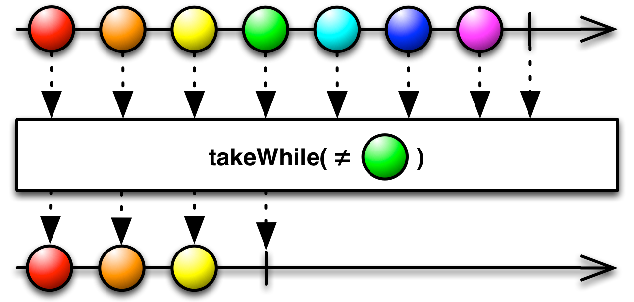 takeWhile( )andtakeWhileWithIndex( )— emit items emitted by an Observable as long as a specified condition is true, then skip the remainder - (