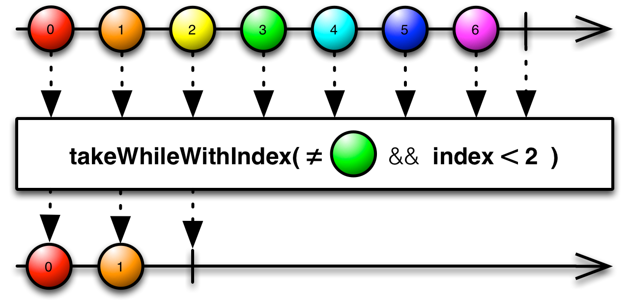 The takeWhileWithIndex( ) method is similar, but your function takes an additional parameter: the (zero-based) index of the item being emitted by the source Observable.