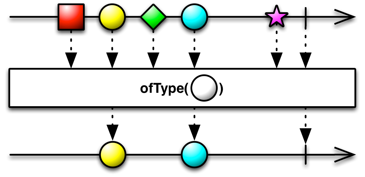 ofType( )— emit only those items from the source Observable that are of a particular class -