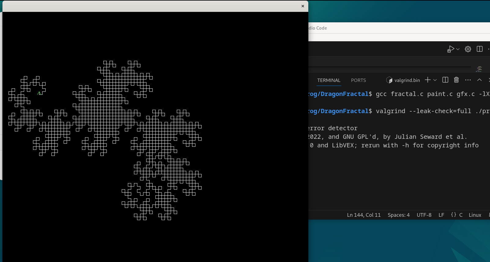 The project consists of a simple C program that uses the paint.h and gfx.h header files provided by my university and my personal implementation of linked lists. The program starts drawing the dragon fractal on the terminal. The number of iterations can be changed in the source code.