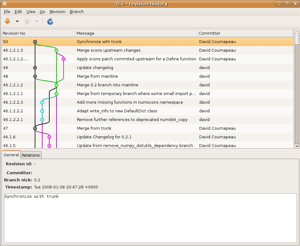 Each color in the drawing of the branch history corresponds to another branch. As you can see, merging branches is a regular occurrence. The idea is that there are several local branches, each for one special feature being working on. Since numscons is using another project internally, SCons, David has a branch which keeps track of SCons changes; a branch which is the mainline, a branch for the current version he is working on (0.2 in this case), etc... Also, since he work at different places, he sometimes just copies branches on a USB disk to transfer a branch from one computer to the other. This should convince you that merge is a much more robust feature with Bazaar than it is generally with Subversion.