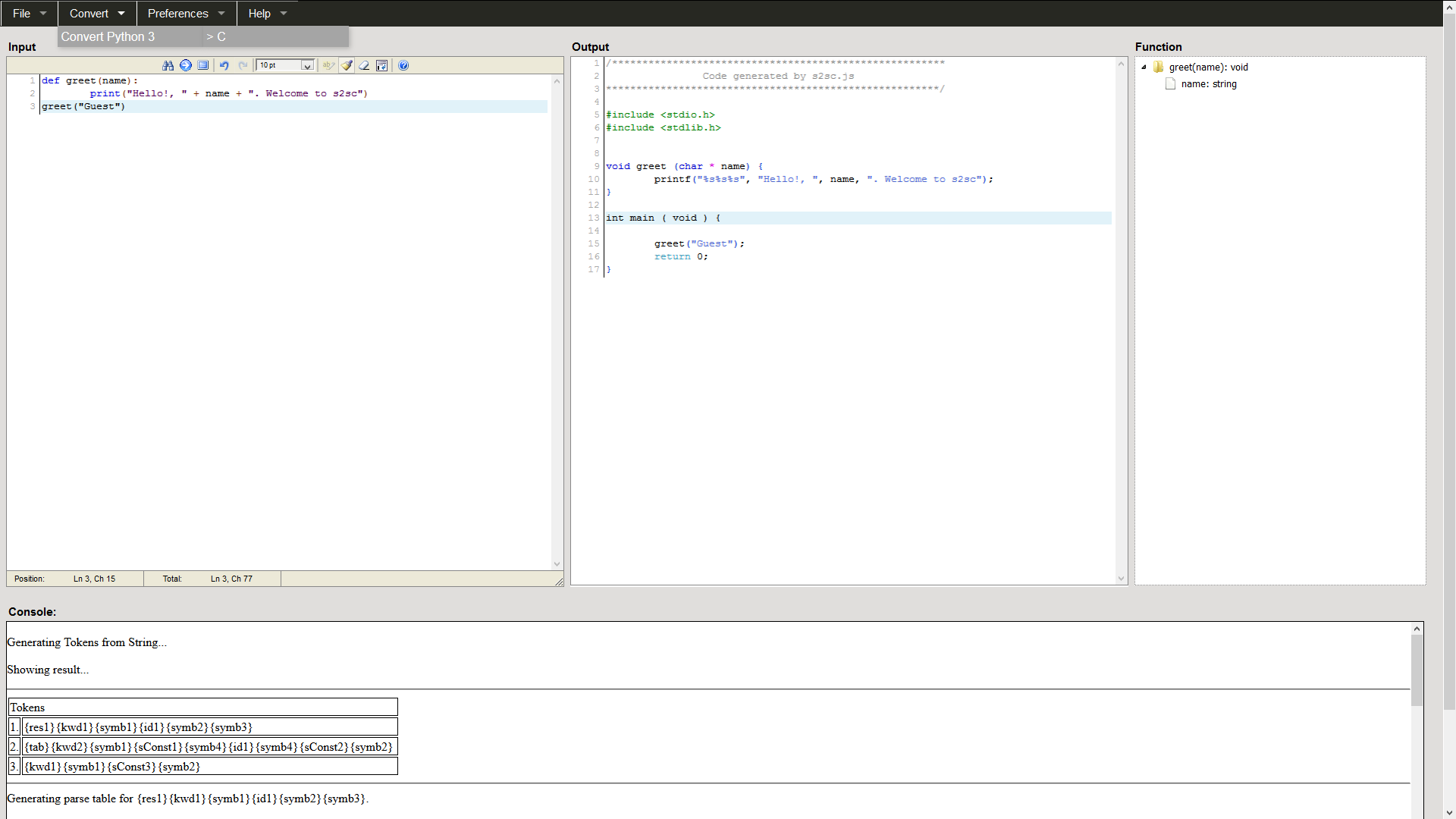 By calling out s2sc.convert() will instruct s2sc to generate an equivalent code from another language base on the source language that was given to it. The convert function has 3 parameters, the first one specifies the source language, while the second specifies the target language and the third parameter is the string of the source code. It can be called directly and be used by other functions since the result of the convert function is just a string that can be manipulated directly by other applications.