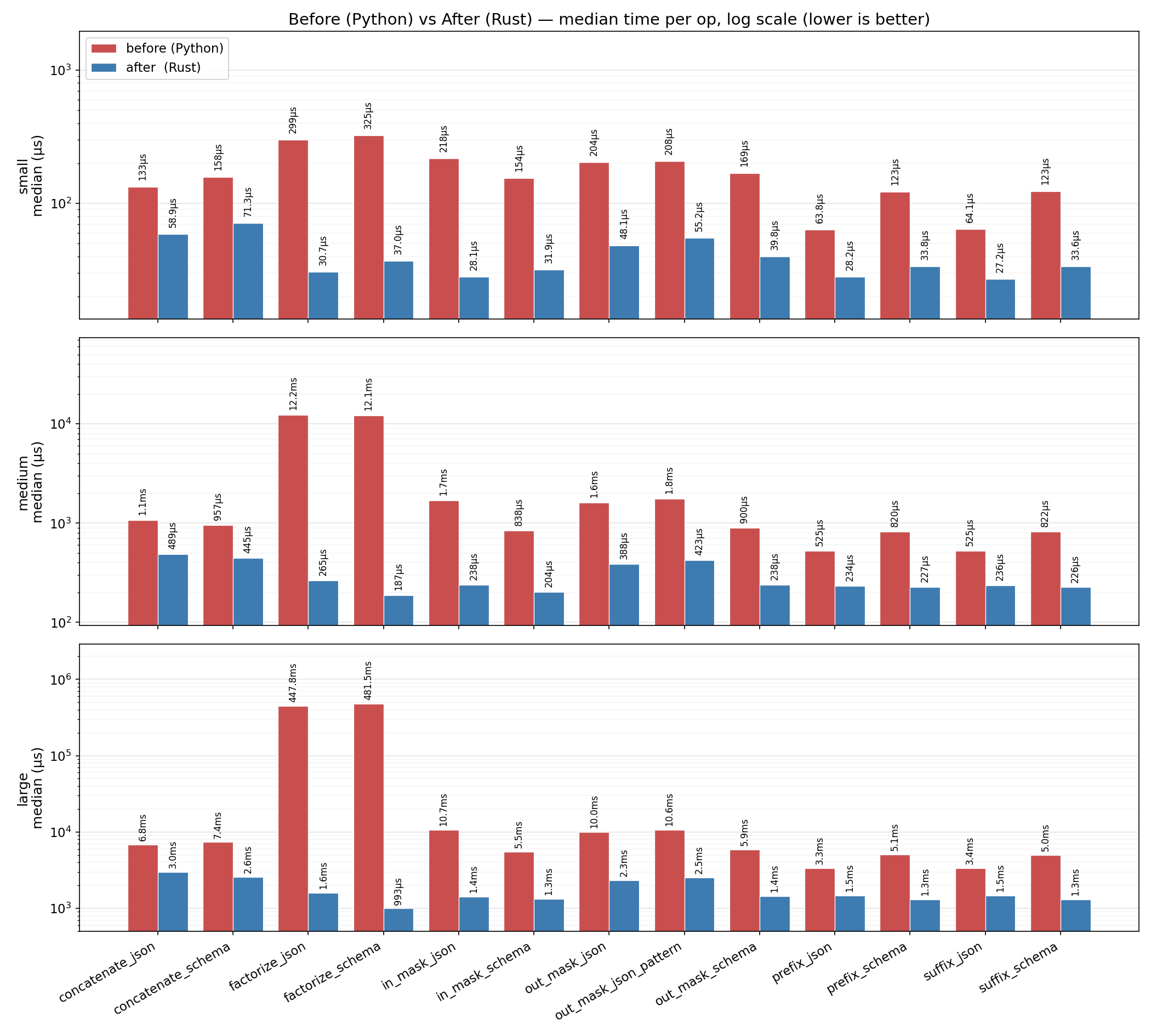 is_object,is_array,is_schema_equal,contains_schemaare intentionally not ported. They are single-key lookups or dict comparisons whose cost is dominated by the PyO3 / dict-conversion boundary, so the pure-Python versions in synalinks are faster.