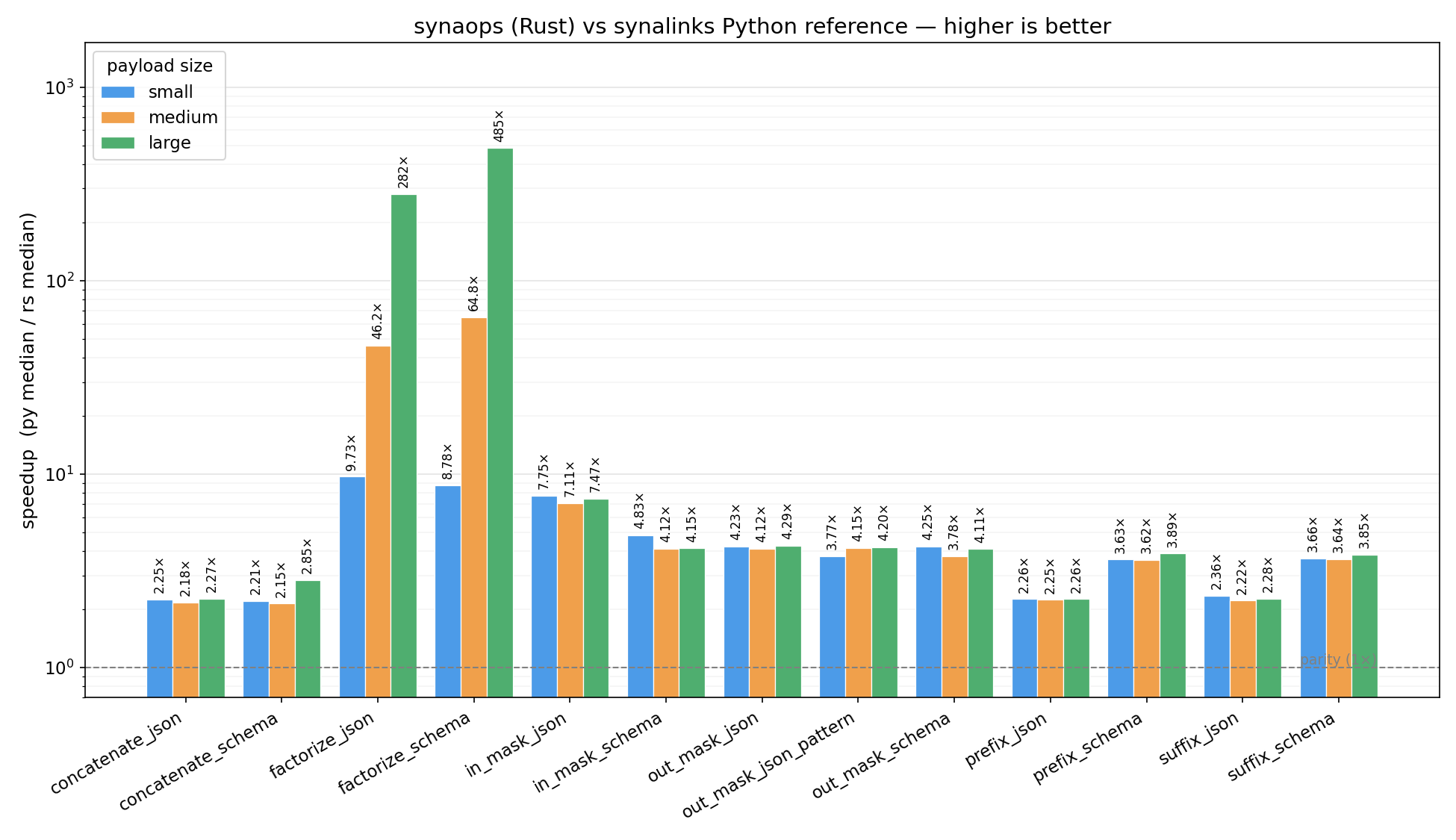 Ratio py_median / rs_median per op. Higher is better; dashed line is parity (1×).
