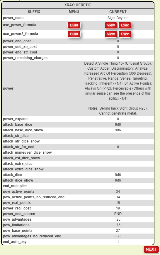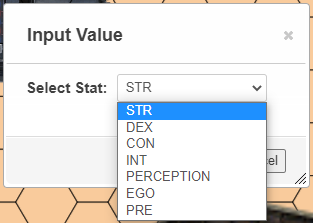 Let's say that for my character, Heretic (Hero System 6E), I wanted to build a query of nicely formatted stat choices that trigger the roll template if I select that stat. The character sheet I'm using has various attributes for these stats, but the ones I'm interested in are named str_roll_formula, dex_roll_formula, con_roll_formula, etc. Each one has a roll template that looks like:
