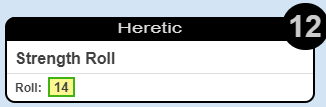 STR,&{template:hero6template} {{charname=Heretic}} {{action=Strength Roll}} {{roll=[[3d6]]}} {{target=12}}|