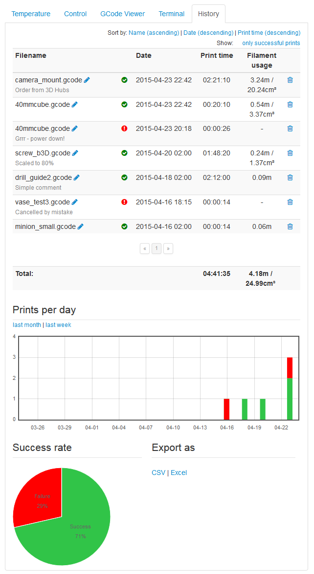 Plugin for OctoPrint - saves filename, print time and filament usage for each print