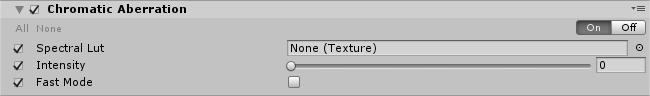 The Chromatic Aberration effect is used to replicate this camera defect, it is also often used to artistic effect such as part of camera impact or intoxication effects. This implementation provides support for red/blue and green/purple fringing as well as user defined color fringing via an input texture.