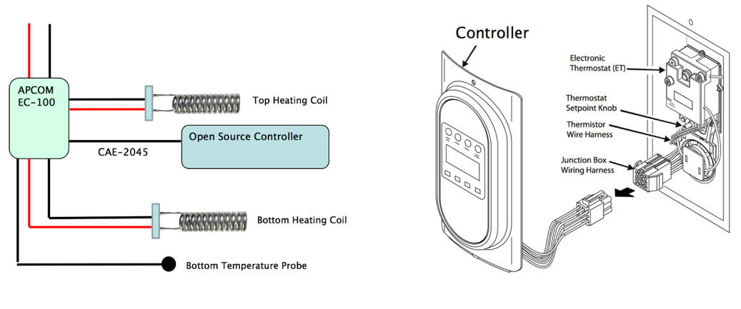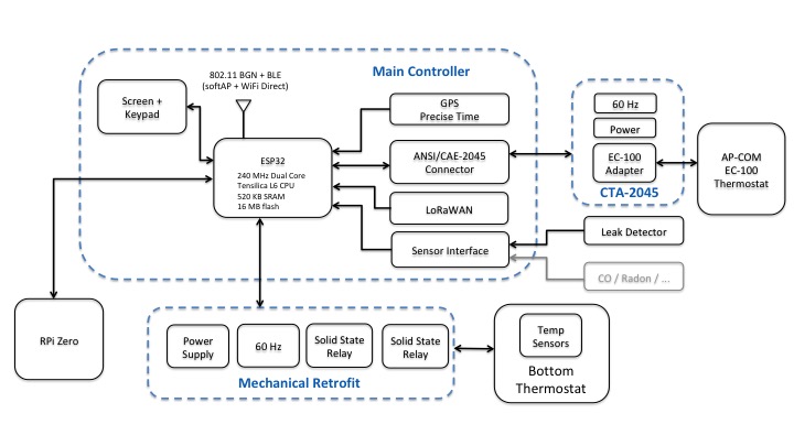 The open-source controller hardware is based around the Espressif Systems ESP32 microcontroller which has a connector for anexternal Raspberry Pi. The ESP32 is a single chip 2.4 GHz Wi-Fiand Bluetooth combination that provides a low-cost 240 MHz dualcore Tensilica LX6 processor with 520 KB of SRAM and 4 MByte offlash. The integrated wireless transceiver supports 802.11bgn witha stack that allows it to operate in both client, WiFi direct and APmodes to simplify installation. The chip comes with support forWEP, WPA/WPA2 PSK/Enterprise security with hardware accelerated encryption for AES / SHA2 / ECC and RSA-4096 standards.