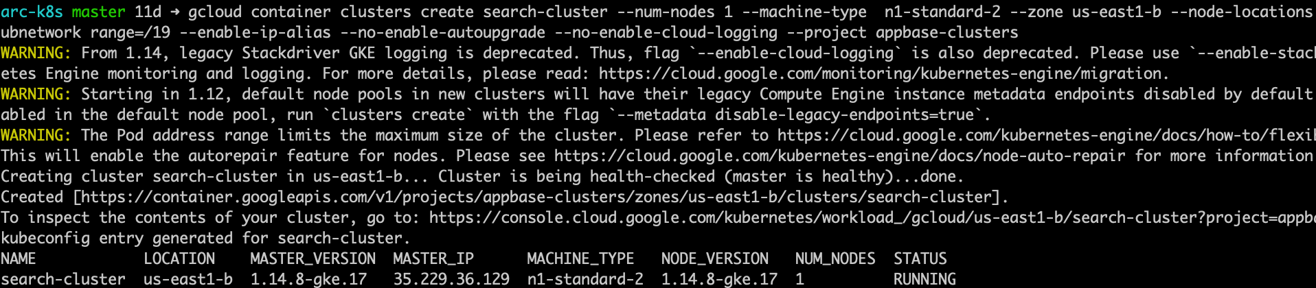 glcoud container cluster createcommand docs. Also in the above command, you can choose a different zone, machine size, number of nodes, etc based on your requirements.Once the cluster is created you will get cluster IP + status in output.