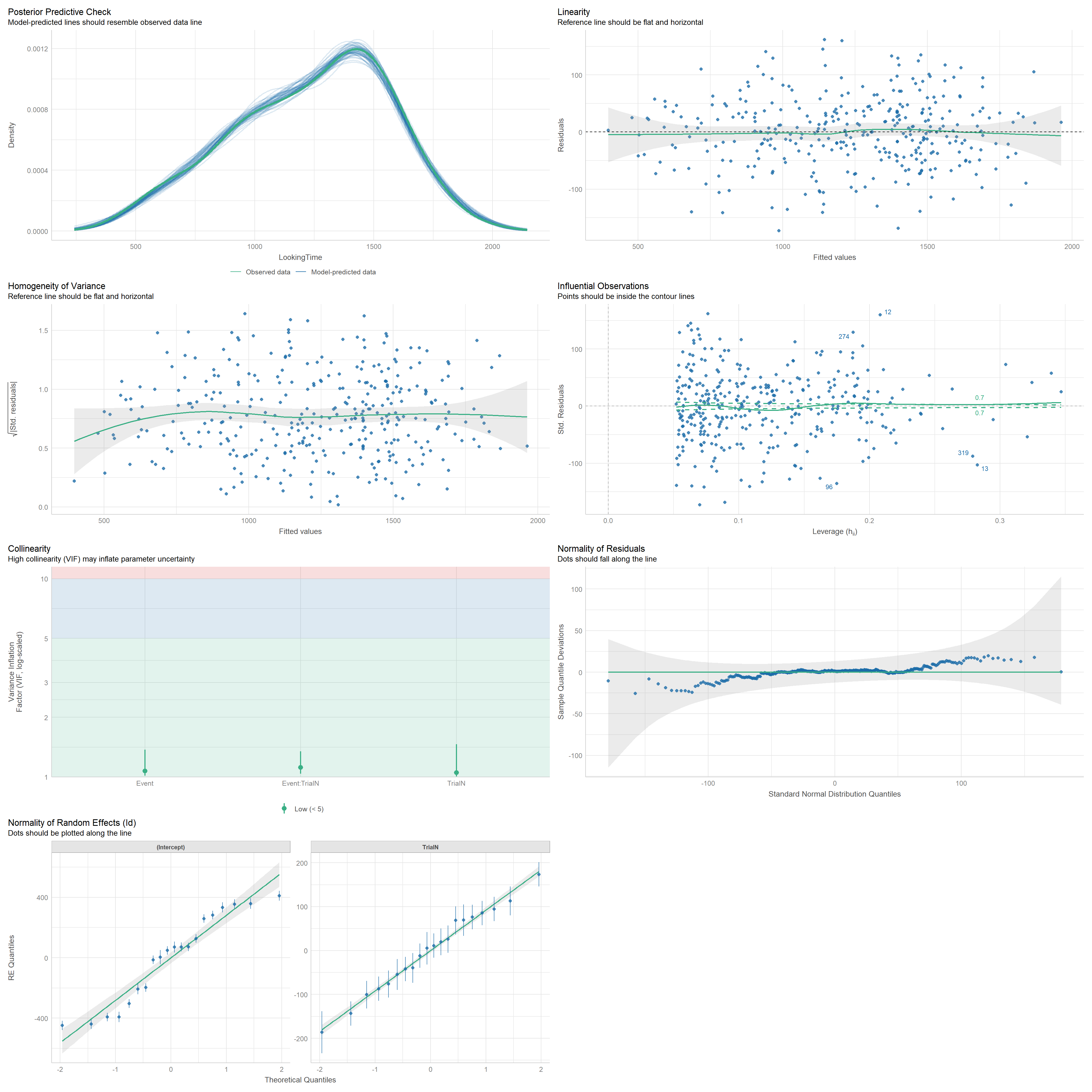 mod <- lmer(LookingTime ~ Event * TrialN + (1 + TrialN | Id), data = df)check_model(mod)check_outliers(mod)
