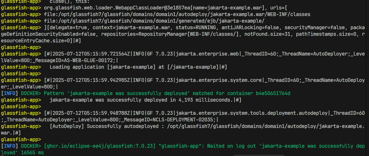 Hello everyone https://github.com/diegosilval/jakarta-example-glassfish In it, I create an application to be deployed in a GlassFish container using fabric8. I reviewed the documentation (https://glassfish.org/documentation.html#docker), and it says to use this image: After deployment, and without any errors you can see that it's in the list of deployed applications. However, when I try to open the application URL, it throws a 404 error, as if it doesn't exist. However, if I deploy the same application to a GlassFish on my local computer, it doesn't throw that error. Did I do something wrong or am I missing some configuration? |