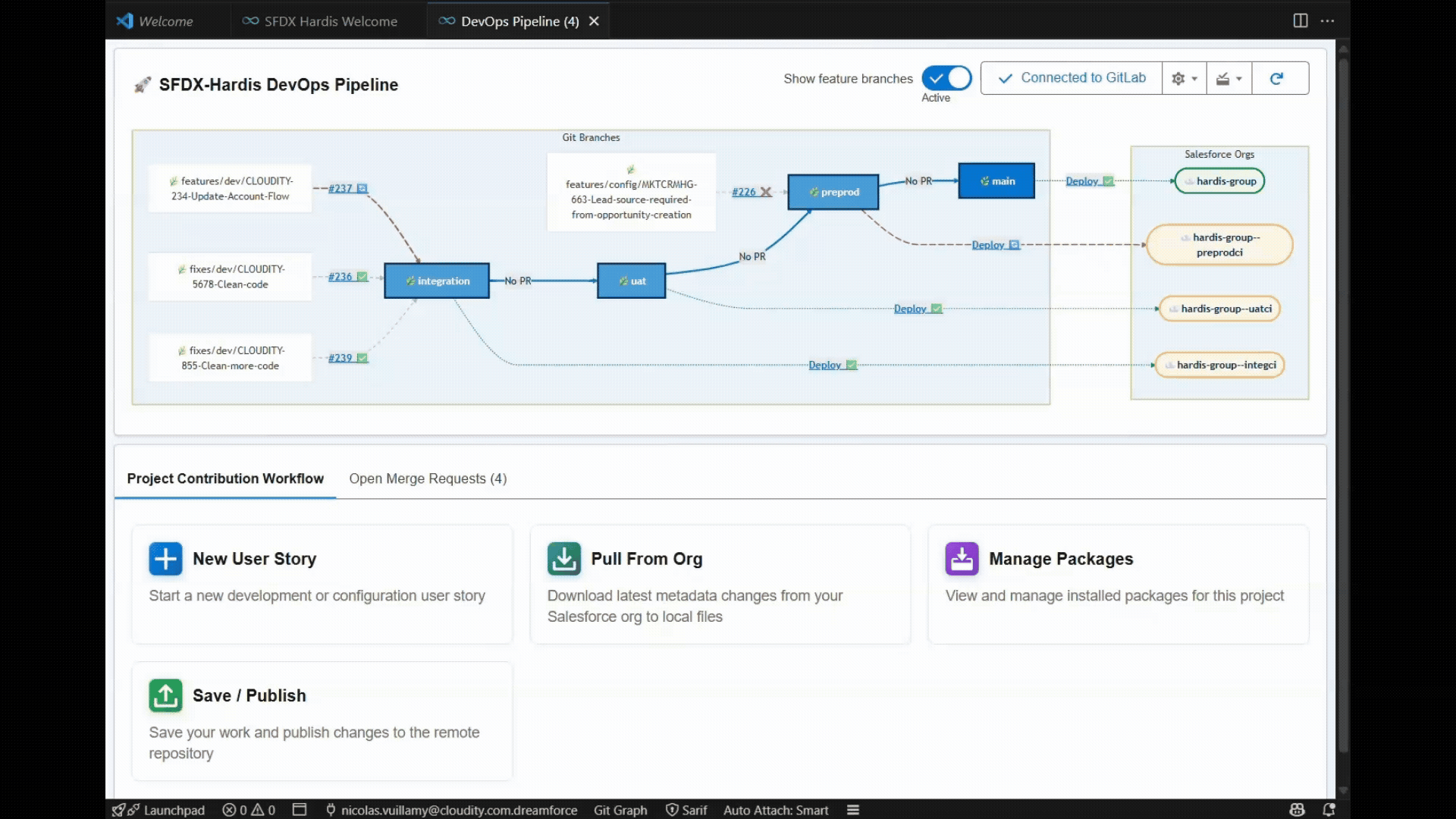 Sfdx-hardis is a CLI and visual productivity tools suite for Salesforce, by Cloudity & friends, natively compliant with most Git platforms, messaging tools, ticketing systems and AI providers (including Agentforce).