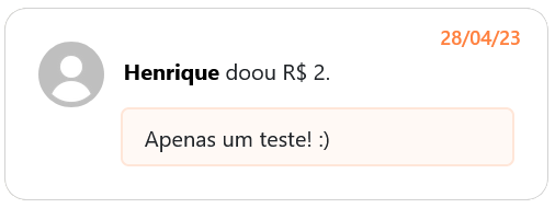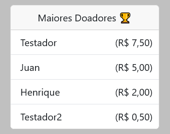 Após a aprovação do pagamento, a doação do usuário será exibida na tela inicial do site, contendo o apelido, o valor doado, a data da doação e uma mensagem (se houver). Semelhante ao Buy me a coffee e Twitch.