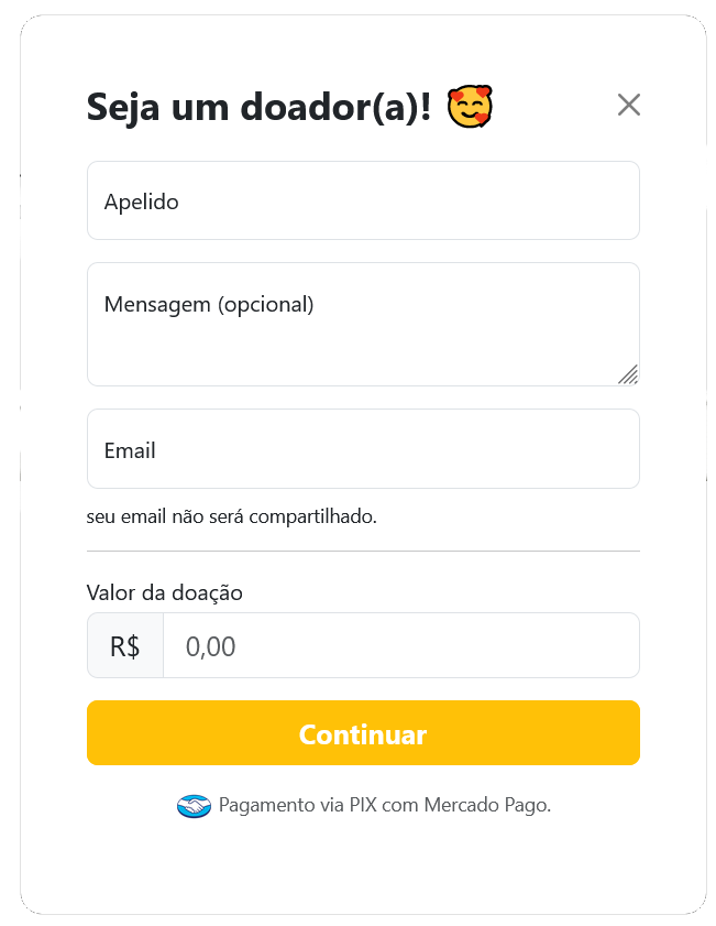 O objetivo deste projeto é permitir doações para uma pessoa ou projeto, sem a necessidade de autenticação. O visitante pode contribuir com qualquer valor, bastando preencher alguns dados, como seu apelido, e-mail e mensagem a ser compartilhada com quem acessar o site.