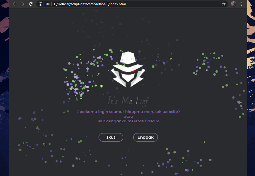 Script Deface (SC Deface) adalah alat tempur paling penting yang digunakan oleh para defacer, mayoritas sc nya berextensi { '.html' dan '.php' }. Berisi ratusan code berbahaya, sebut saja backdoor. Sekilas mirip seperti virus komputer. Defacer mencari celah suatu web, jika ditemukan nya bug/celah mereka mulai beraksi dengan sc nya dan booommm tampilan halaman depan website berubah menjadi tampilan sc mereka. Selanjutnya apalagi ?... Biasanya mereka akan pamer ke temen nya, mereka sebarkan url web yang baru saja diubah halaman depan nya ke komunitas nya dan mengatakan bahwa saya berhasil deface web contoh: { nasa.gov }. Bukan dikomunitas saja, mereka juga akan pamer ke situs web { Mirror } mereka menyebut nya { push mirror }. Saya sendiri sering mengunjungi berbagai situs mirror, saya melihat hasil mereka disitu, namun saat saya melihat sc mereka... itu semua berantakan. SC mereka dimata saya itu sangat biasa" saja :). Karena saya memiliki hobi web design, saya mencoba bikin sc deface dengan mempadukan design web yang pernah saya buat sebelumnya. Saya coba" dulu membuat dengan menyamakan sc deface mereka, yaaa tidak begitu mirip, why ? Sebab saya mempercantik dan merapihkan nya. Beda jauh sekali, yang tadinya biasa" saja sekarang menjadi luar biasa :). Apa yang akan saya lakukan ?, kebetulan banyak temen saya hobi nya deface web, saya beritahu mereka { pake sc ku kawan, para mastah mu akan minder saat kamu tebas index dengan sc yang kubuat ini :D }