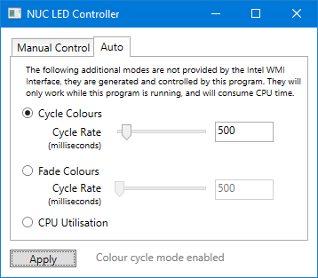 Simple GUI tool to control the front panel LED ring on newer Intel NUCs (such as the NUC7i and the NUC6CAYS series). Requires the 'SW Control' option to be set in the BIOS.