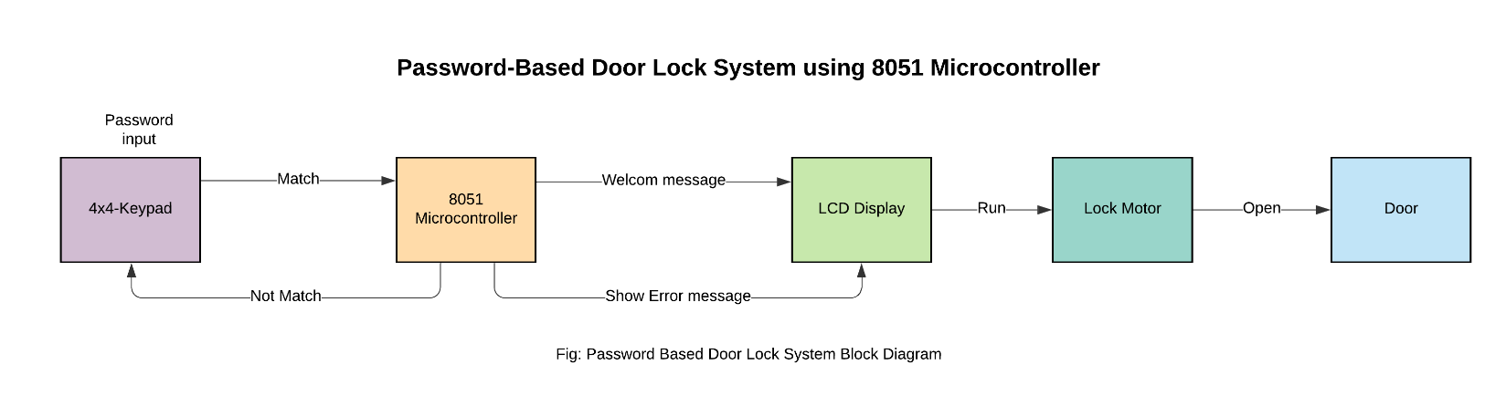 The password-based lock system can install any door of any rooms. This system also can be integrated with the existing system. This electric combination lock system uses a five-digit password. The system collects five-digit user input and compares the user input with the preset password inside the program. If the password matches, access will be granted, and if not match the entry will be denied. The system can be used at residential places to ensure better safety. It can be used at organizations to ensure authorized access to highly secured places.