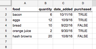 - Format the sheet so that the first row contains the column headers you want your JSON objects to have as properties. Example:
