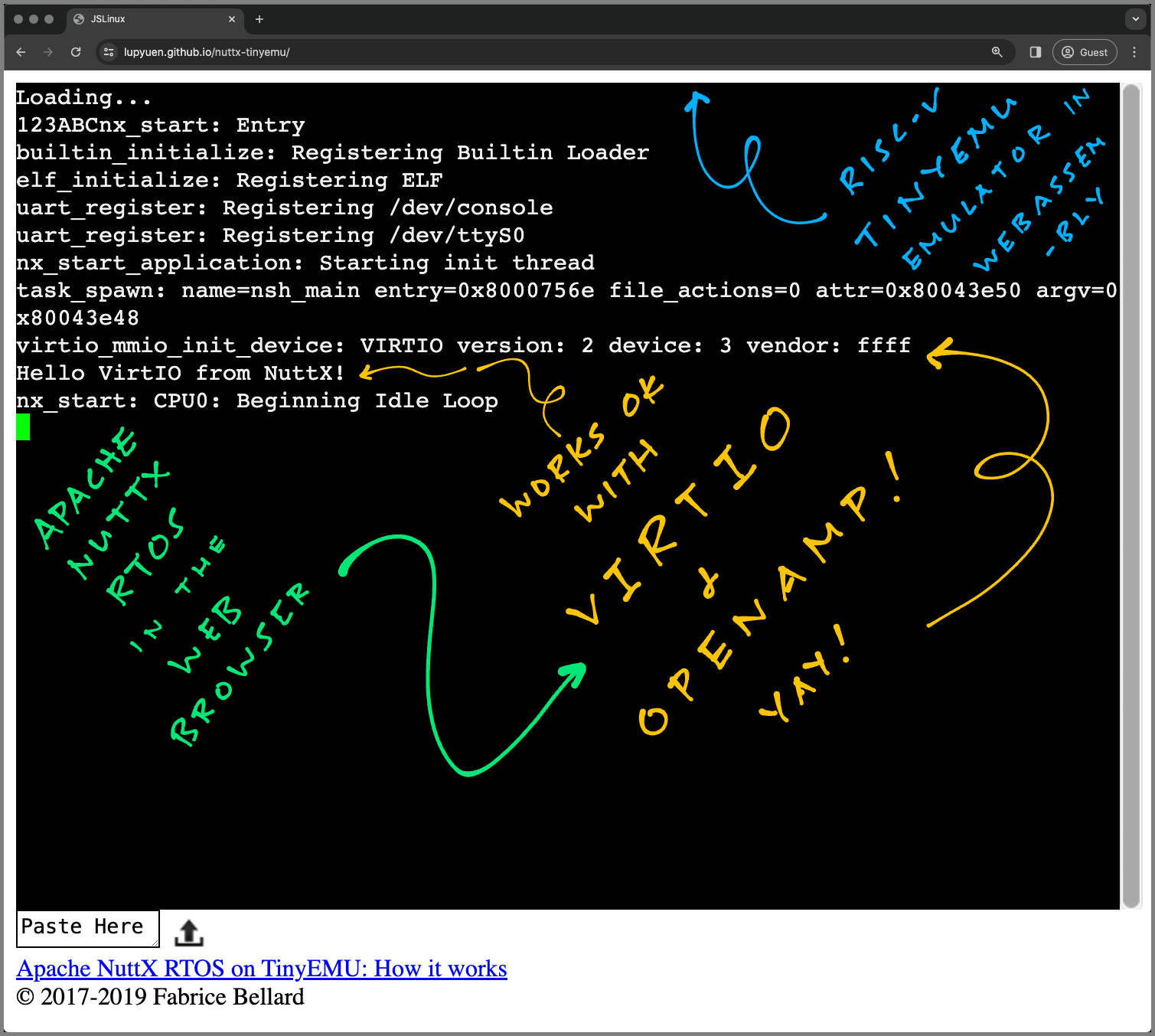 "Apache NuttX RTOS in a Web Browser? Adventures with TinyEMU and VirtIO"