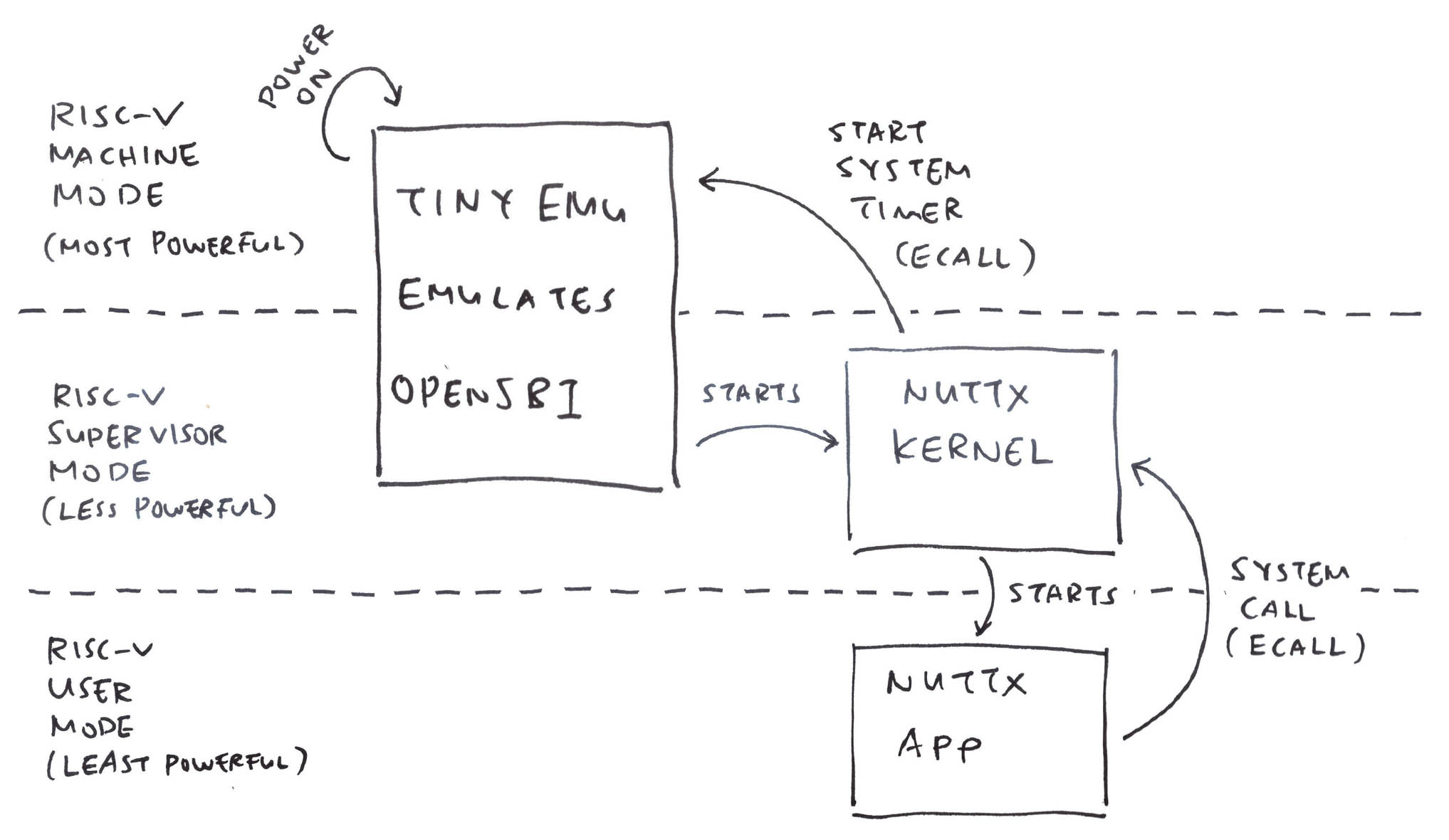 The Latest NuttX Build includes an OpenSBI ECALL. And it works OK with TinyEMU yay!