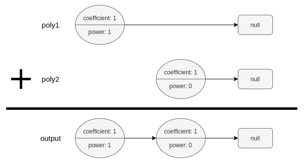 The polynomial linked list must be in its standard form: the polynomial must be in strictly descending order by its power value. Also, terms with a coefficient of 0 are omitted.