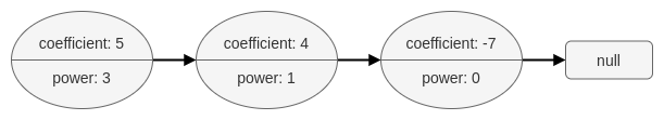 For example, the polynomial 5x3 + 4x - 7 is represented by the polynomial linked list illustrated below: