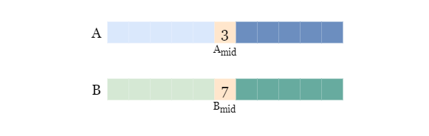 Similarly, we can get and compare their middle values A_mid and B_mid. Without loss of generality in this example we assume A_mid <= B_mid initially, as shown in the yellow boxes.