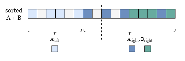 Now we know that A_left is smaller than two halves: A_right and B_right. Although we still don't know where exactly these elements are, what we do know is A_left doesn't intersect with A_right + B_right! There is an invisible boundary between the A_left segment and the mixed segment A_right + B_right. As shown in the picture below, the dashed line divides all sorted elements into two halves.