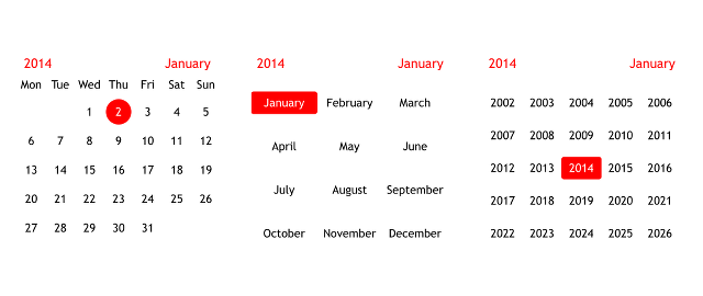 Default - there're days, months and years, the user can change months with help swipe gesture or pinch gesture for transitions in the calendar
