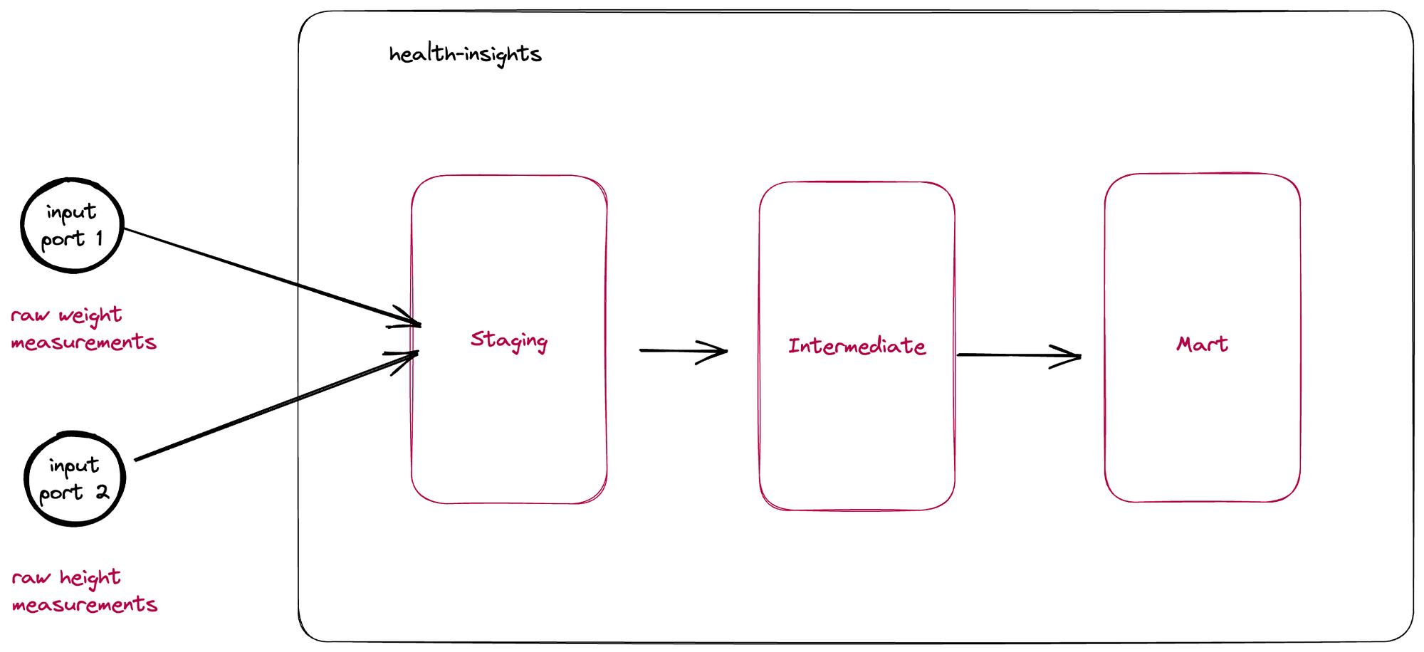 Our sample dbt app is called health-insights. It takes weight and height data from upstream sources and calculates the metric body mass index. It follows the usual layered architecture commonly found in dbt projects.