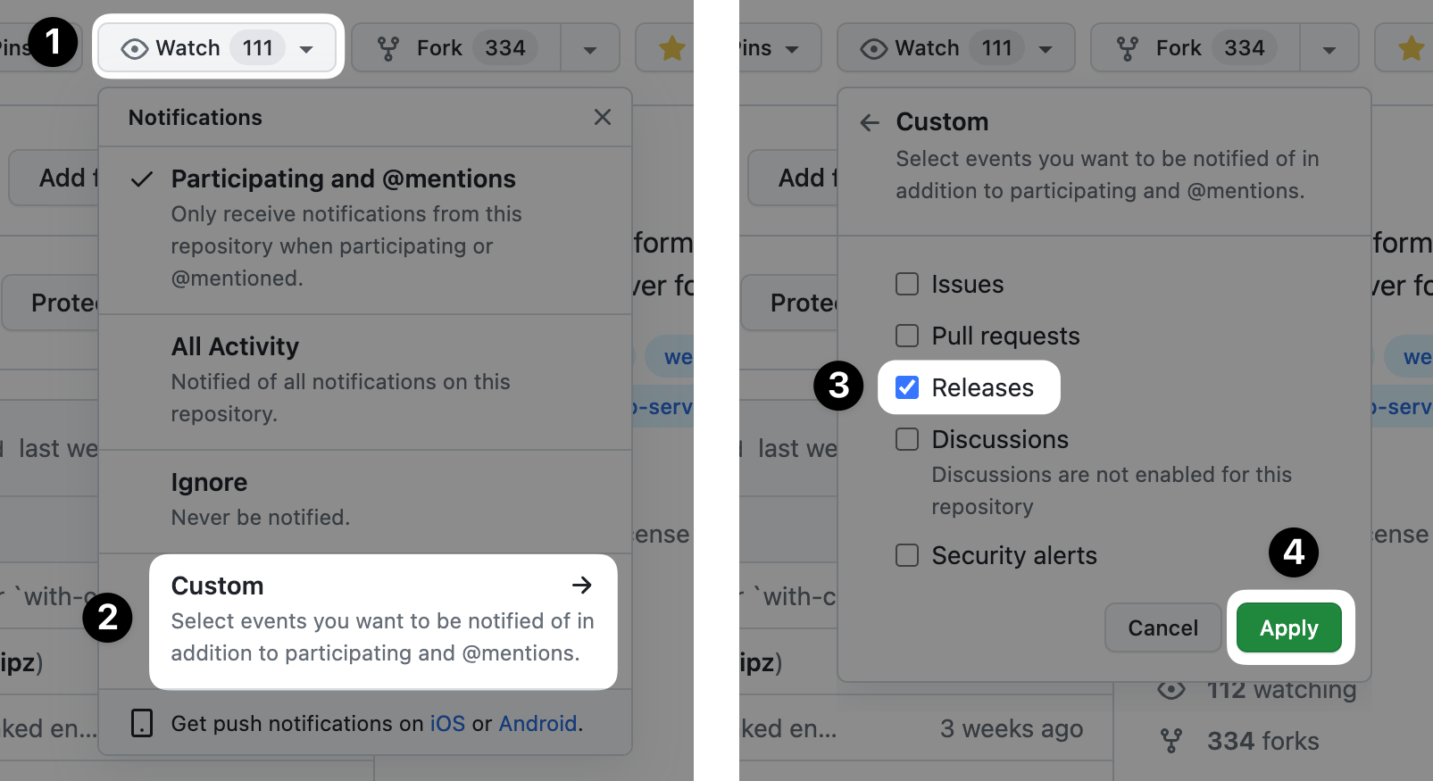 To be notified of new releases, please use GitHub's Watch feature for the relevant repos: